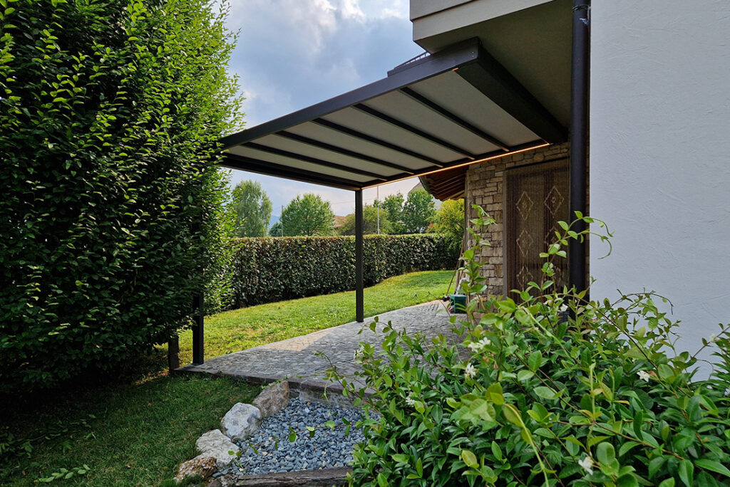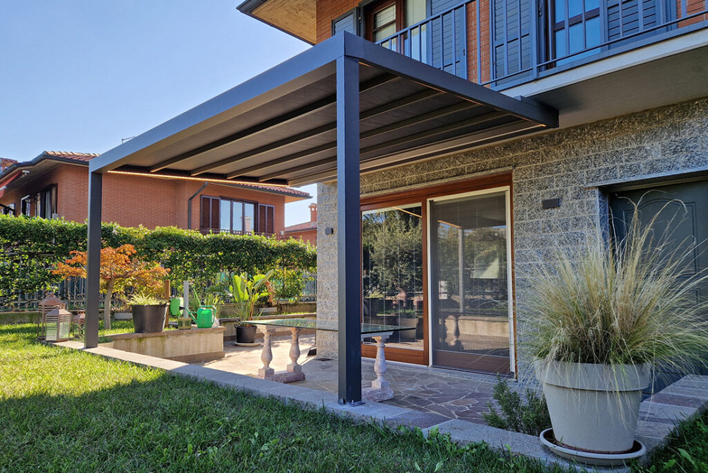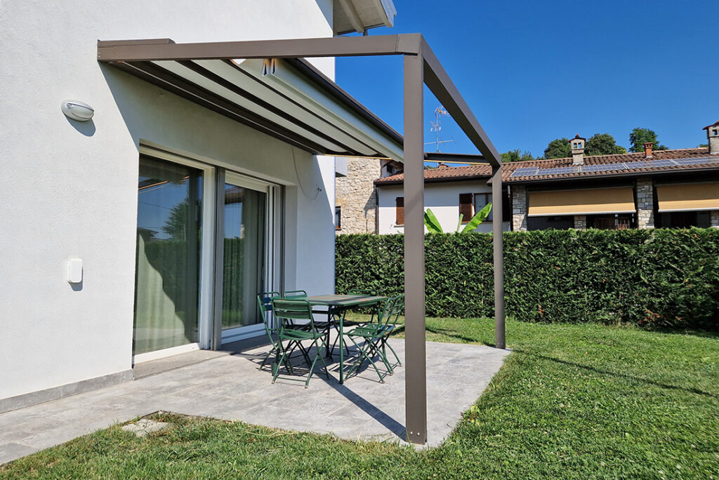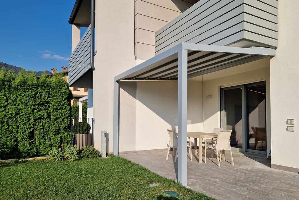 Ma le novità non finiscono qui: la pergola si presenta con un design moderno senza aggetti frontali ma con delle guide perfettamente integrate nella gronda.