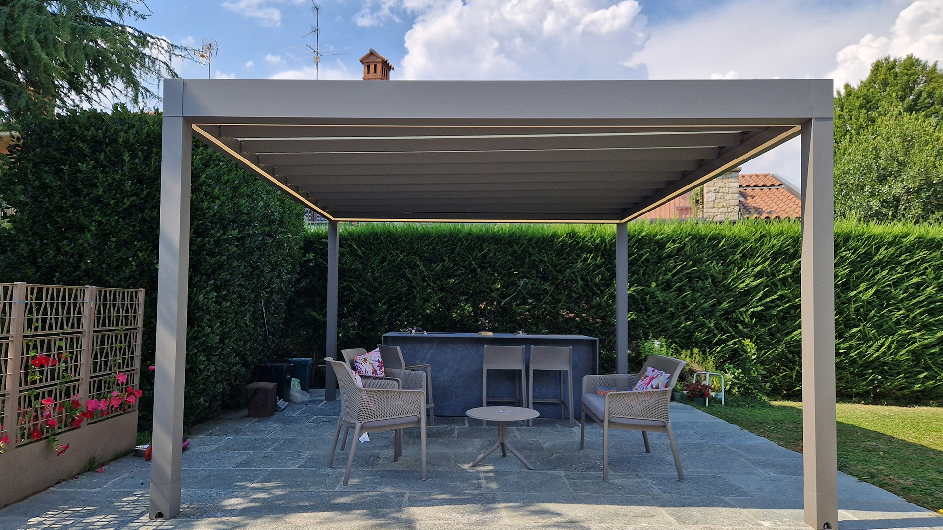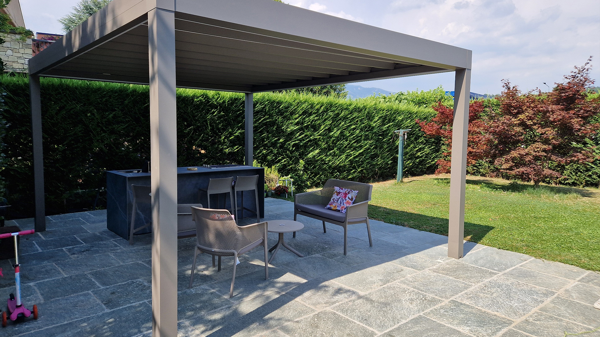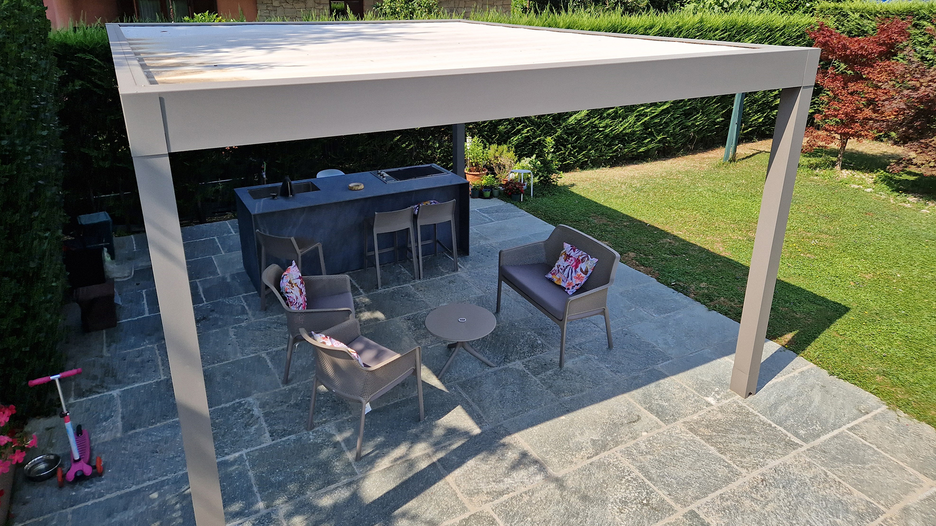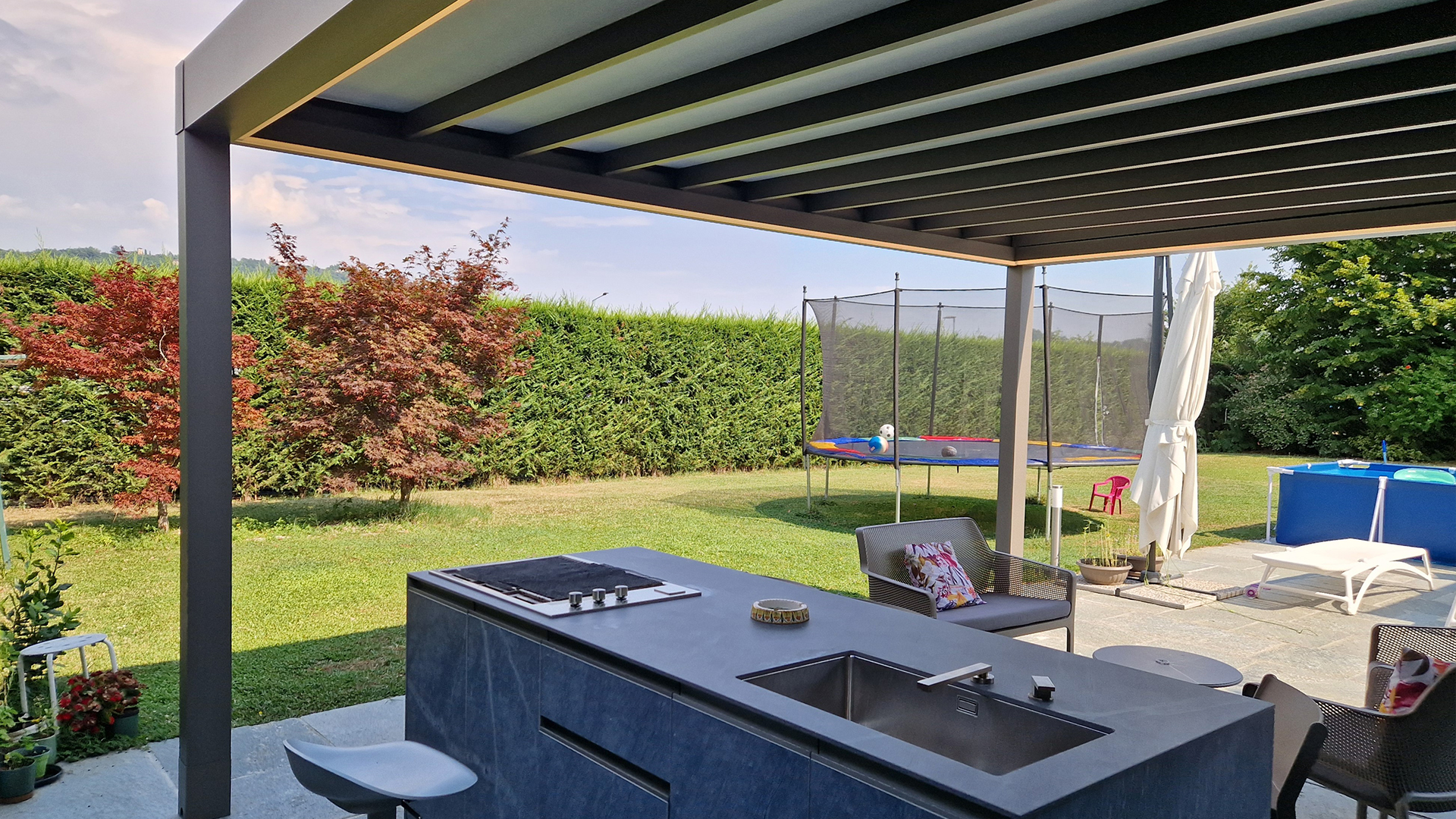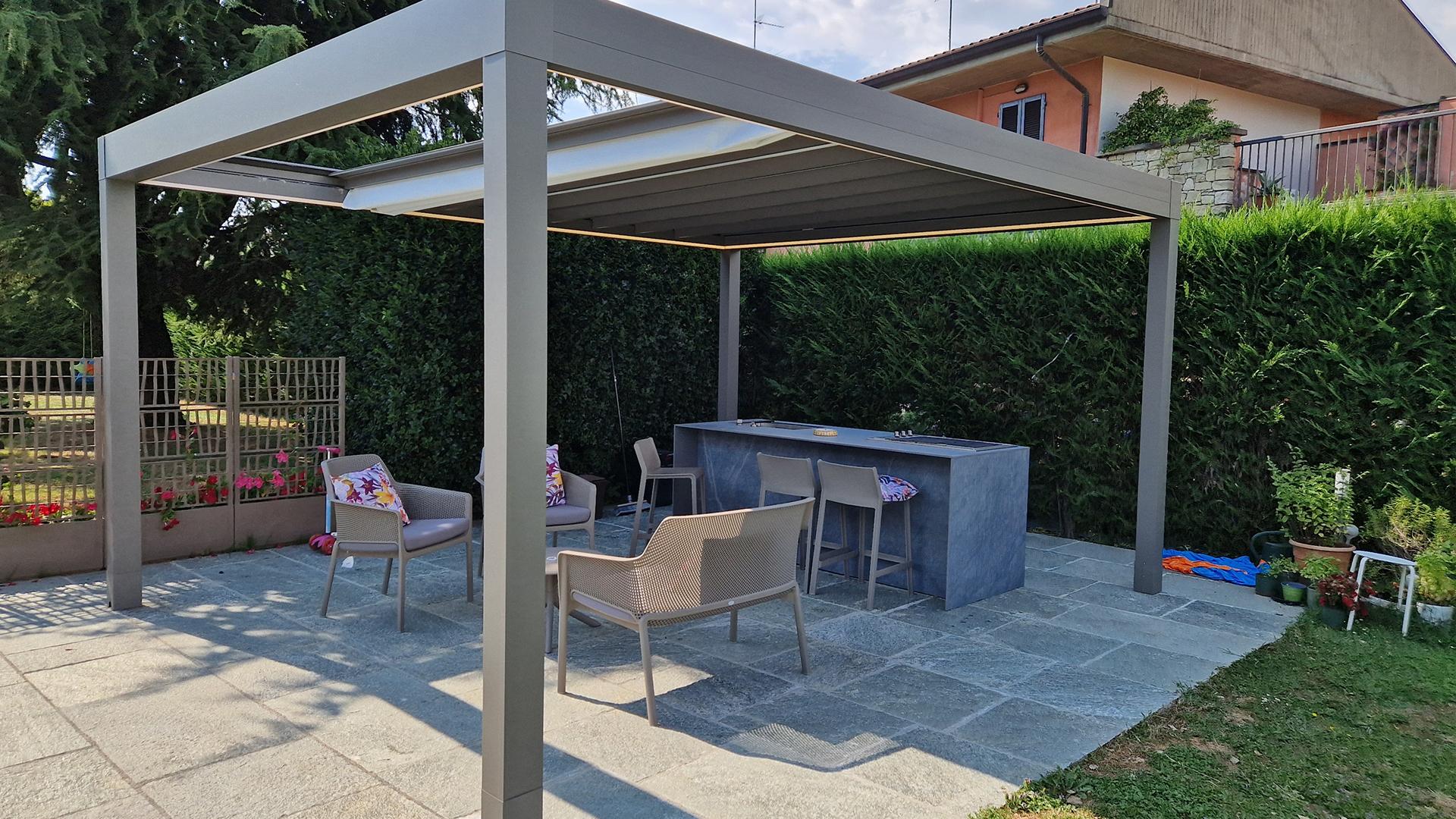 Struttura autoportante ideata e voluta per divenire una cucina esterna. Con ARTIKA 400 abbiamo reso possibile tutto questo. La particolarità del prodotto è quella di avere una struttura di alluminio con gronde perimetrali in cui scorre un telo mobile di PVC OPATEX. Tale copertura è utilizzabile in caso di pioggia perché il telo è leggermente inclinato sul lato desiderato senza alterare l’aspetto estetico.